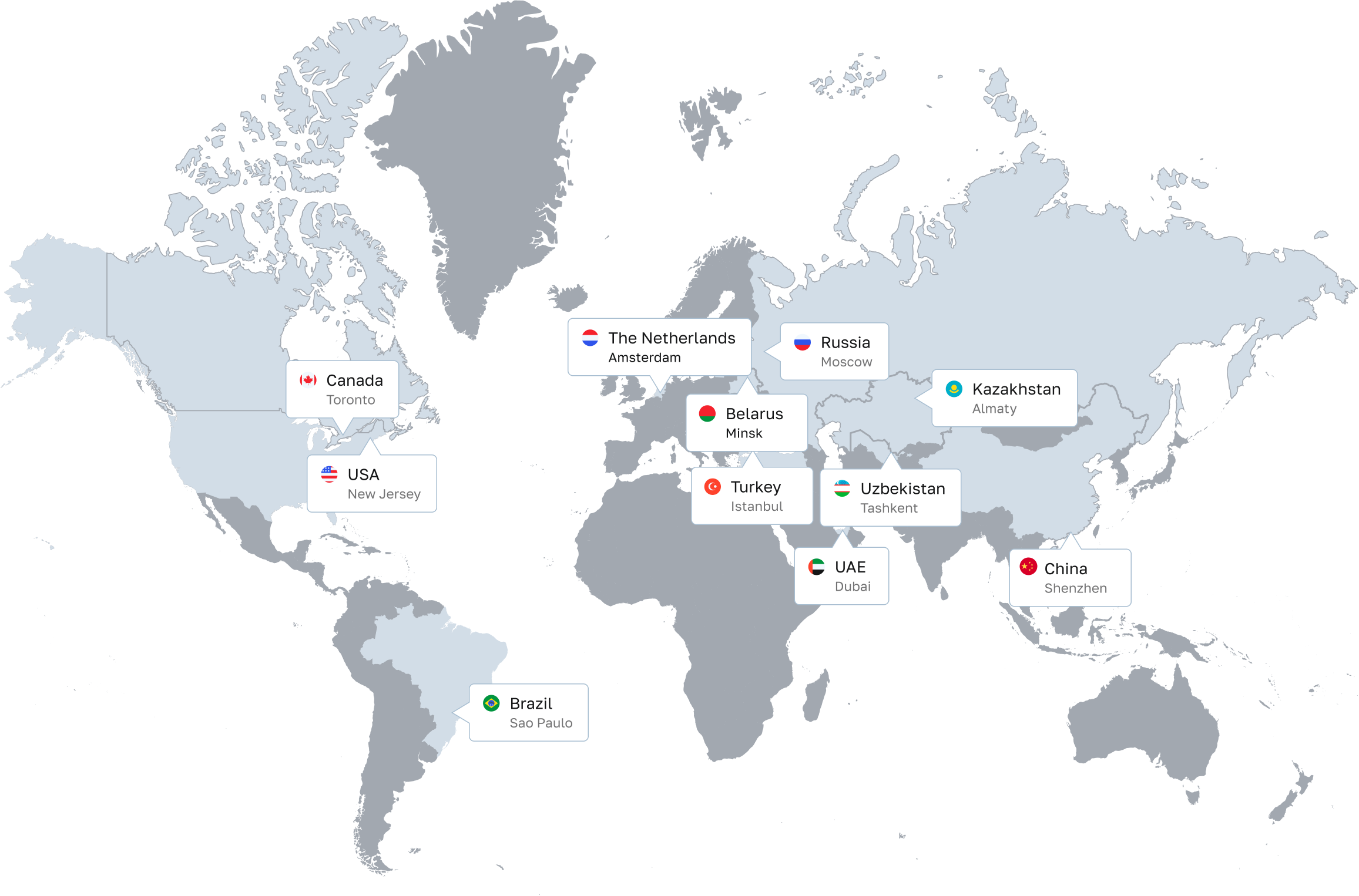 Сегодня представительства компании находятся в Москве, Санкт-Петербурге, Минске, Алматы, Амстердаме, Торонто, Нью-Джерси, Дубае, Стамбуле и Сан-Пауло.