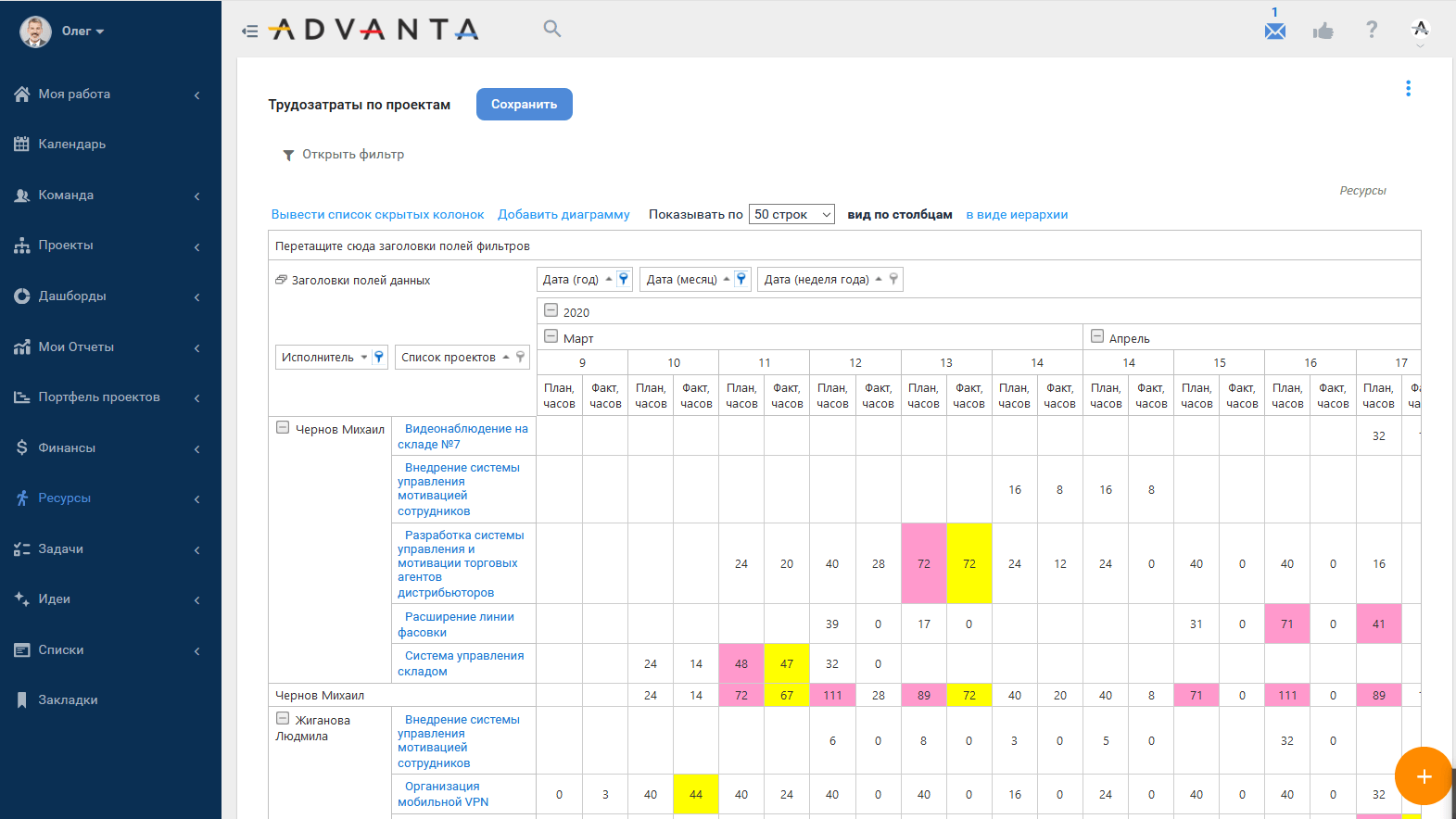 - Управление ресурсами. Система должна показывать загрузку сотрудников (в часах/днях), позволять балансировать ресурсы между разными проектами портфеля и предупреждать о переработках.