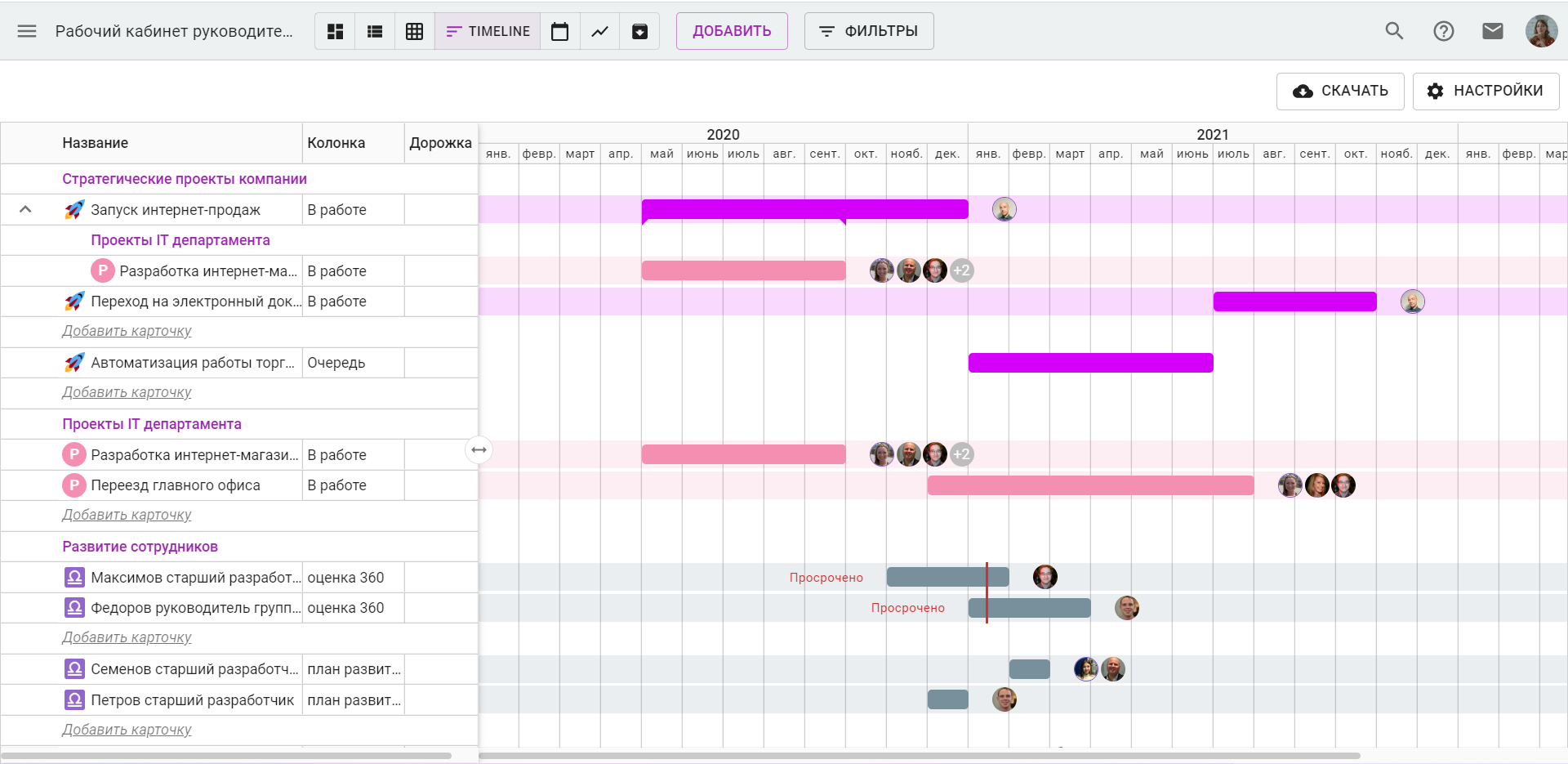 - Мощная визуализация для топ-менеджмента («светофоры» статусов проектов, дашборды);