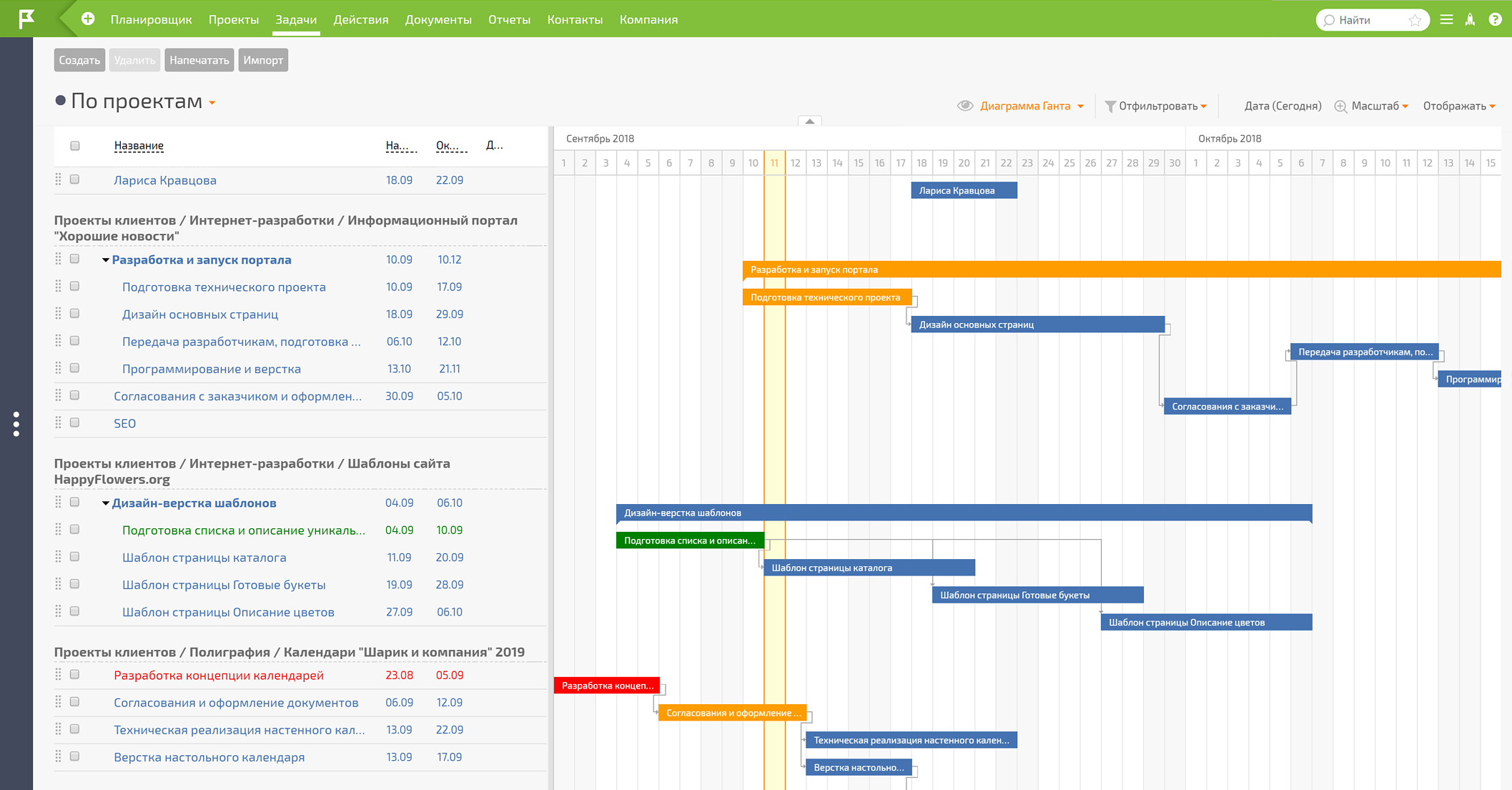 Соответствие MS Project: Диаграмма Ганта в ПланФиксе весьма функциональна: есть связи между задачами, автосдвиг сроков, отображение критического пути и базовые планировщики загрузки сотрудников.