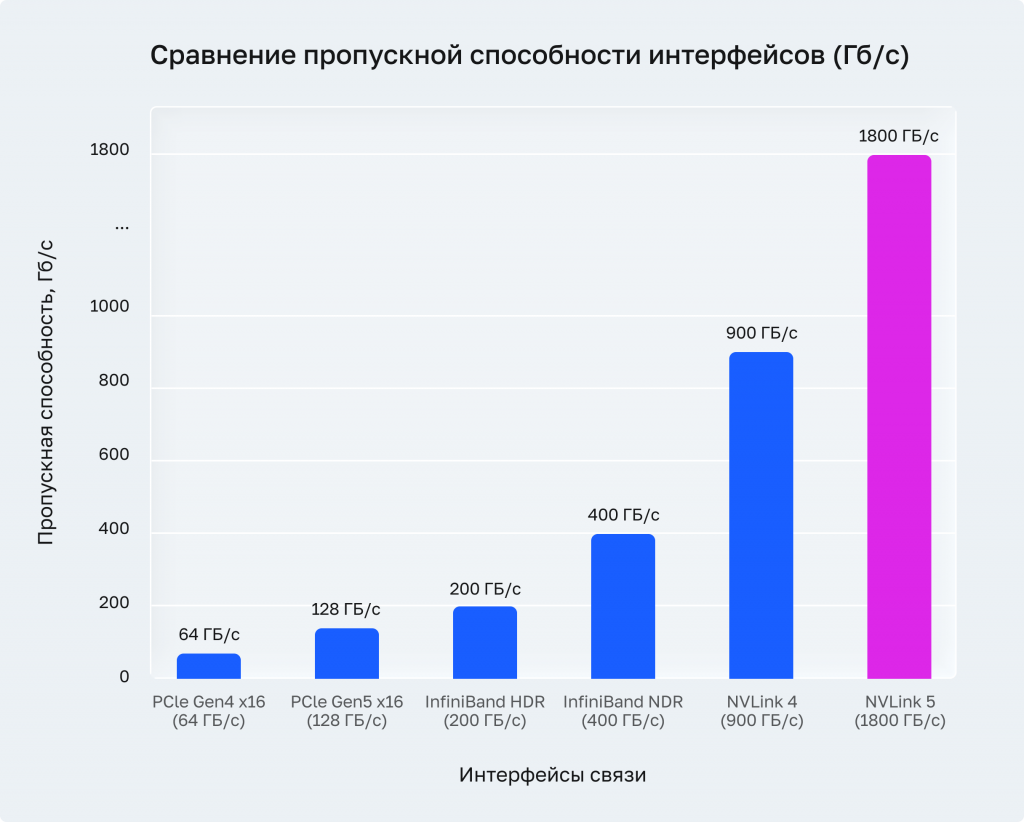 Практическое правило: Tensor Parallelism эффективен только при наличии высокоскоростного соединения между GPU. NVLink с пропускной способностью 600–1800 ГБ/с — обязательное условие. PCIe Gen4 x16 (64 ГБ/с) даёт приемлемый результат лишь для небольших степеней параллелизма (TP=2).
