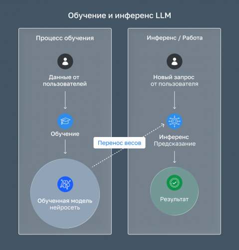 | Что происходит | Настройка миллиардов параметров на датасете | Генерация ответов на основе промптов пользователей |