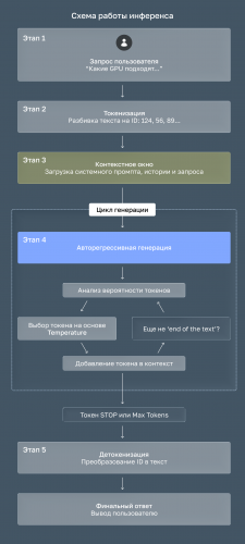 Инференс языковой модели — это процесс превращения входного промпта в готовый ответ. Всё происходит строго последовательно, токен за токеном, с использованием зафиксированных весов модели.