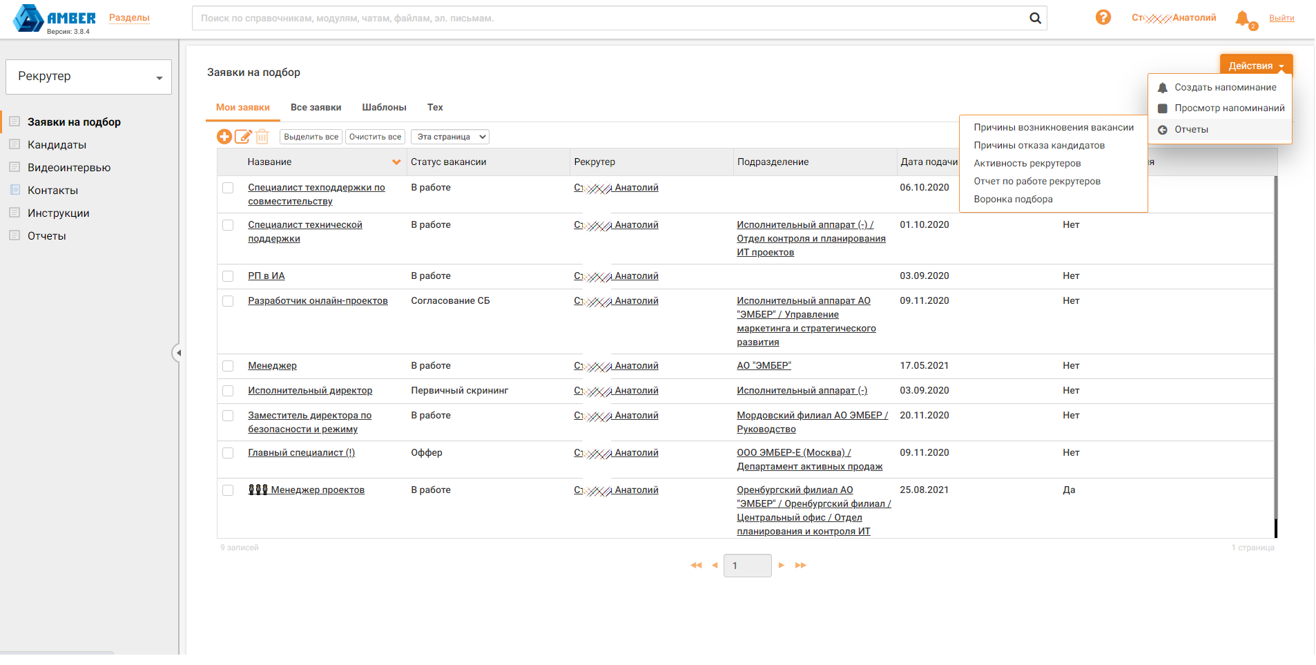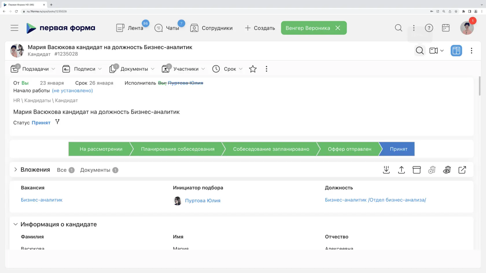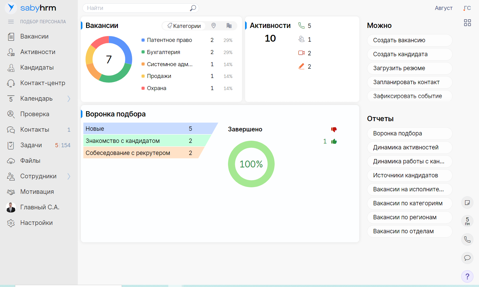 - рекрутинг (ATS): управление базой кандидатов и воронками отбора;
