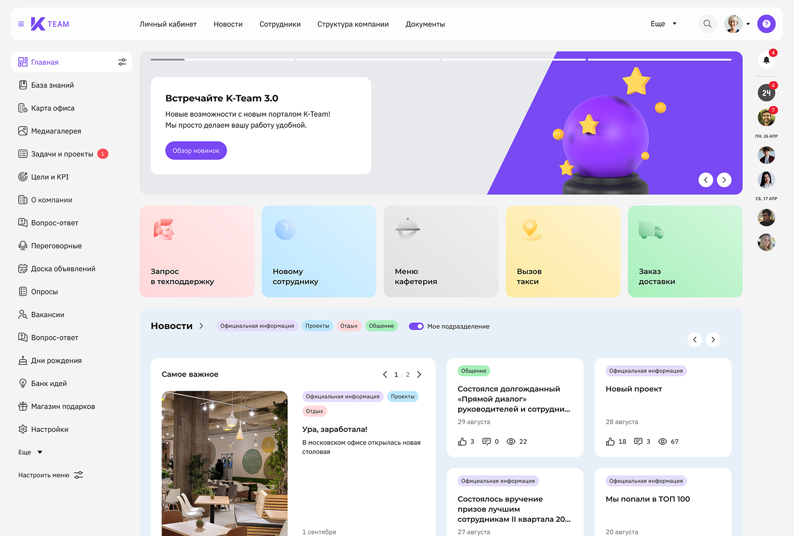 K-Team — это корпоративный портал и HR-платформа, разработанная системным интегратором на базе движка «Битрикс24», но с существенно расширенным функционалом для решения задач HR-департаментов крупного бизнеса.