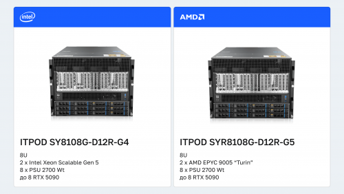 Обе платформы дополняют друг друга: 8U закрывает проекты на базе мощных десктопных карт, 4U — работы с GPU уровня Enterprise, сохраняя единую архитектуру и упрощая масштабирование.