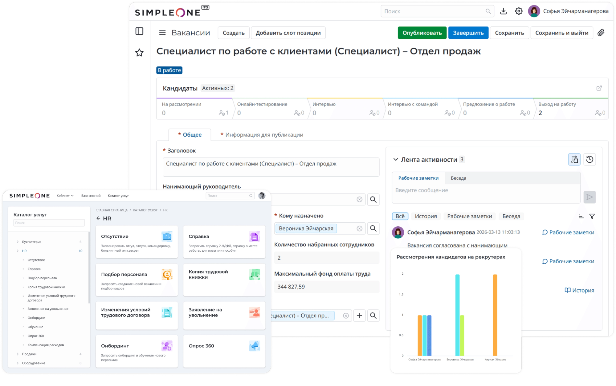 SimpleOne HRMS — это комплексная платформа для управления персоналом корпоративного уровня, построенная на базе современной Low-code архитектуры. SimpleOne HRMS — это не просто ATS, а часть большой сервисной экосистемы (ESM), которая позволяет бесшовно связать рекрутинг с адаптацией (онбордингом), заявками в ИТ, АХО и кадровым документооборотом.