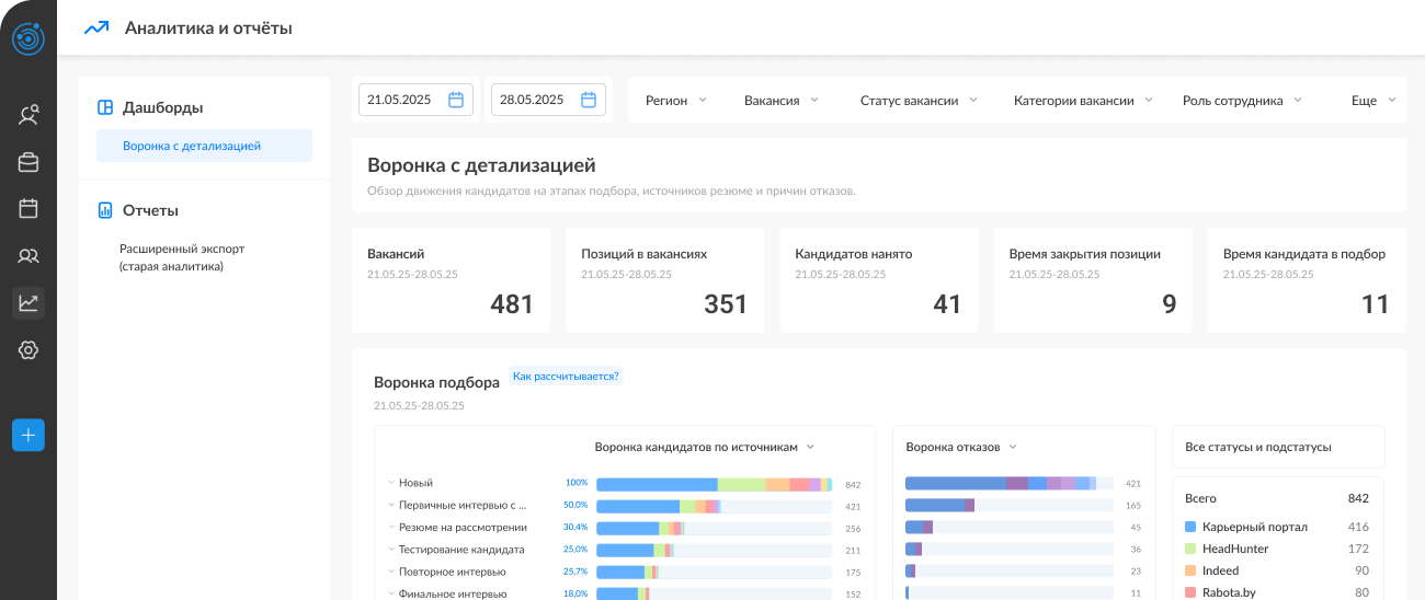 - Готовая наглядная аналитика по воронке подбора и скорости закрытия вакансий;