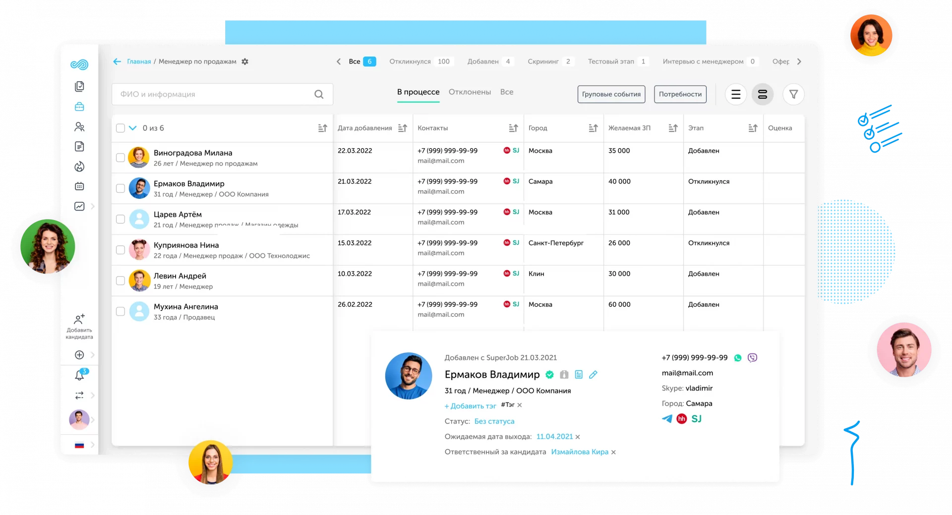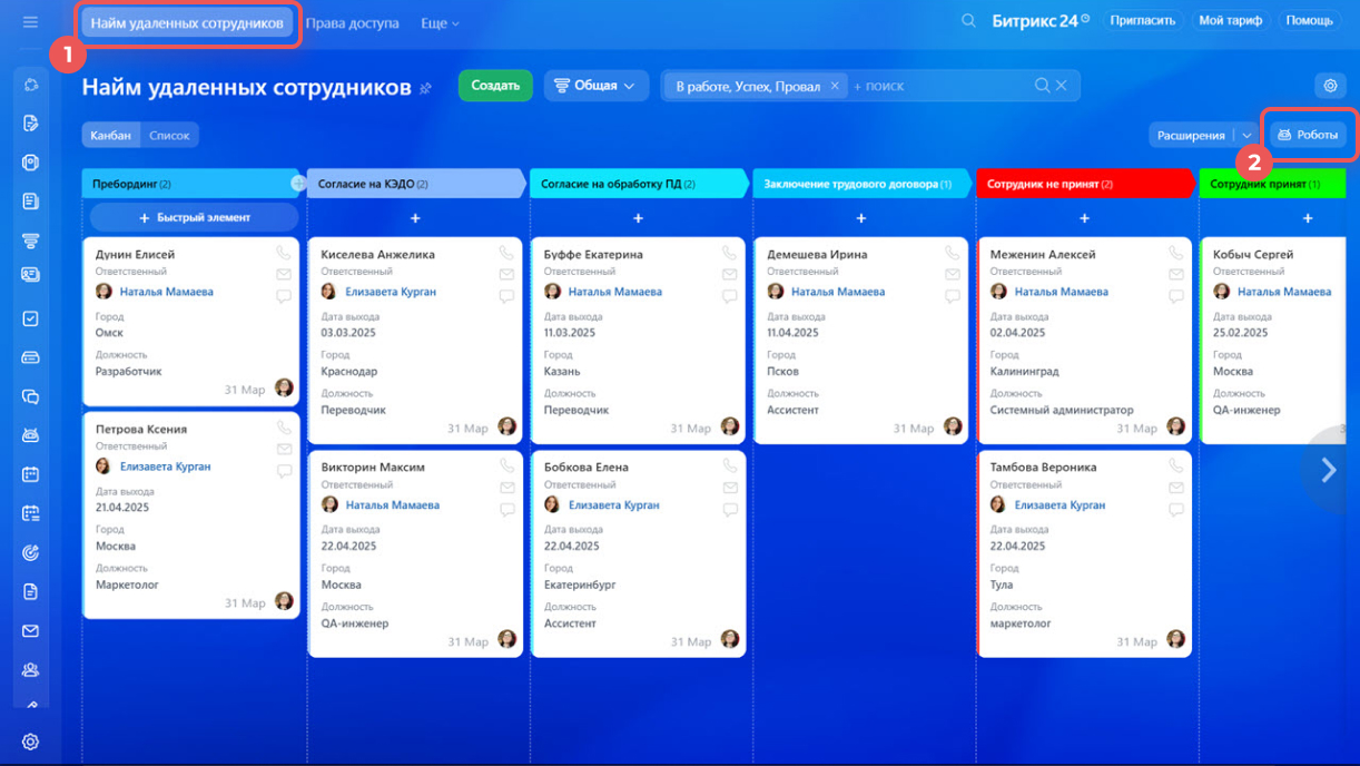 - Канбан-доски для ведения кандидатов по воронке;