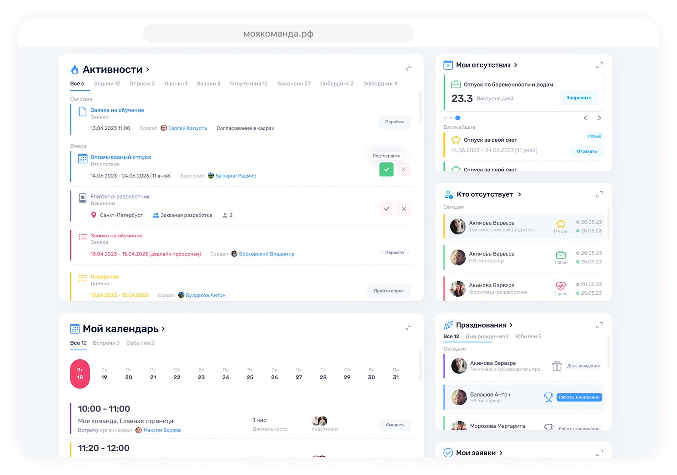 - Полноценный личный кабинет сотрудника с профилем, задачами, согласованиями, корпоративным календарем и программой лояльности;