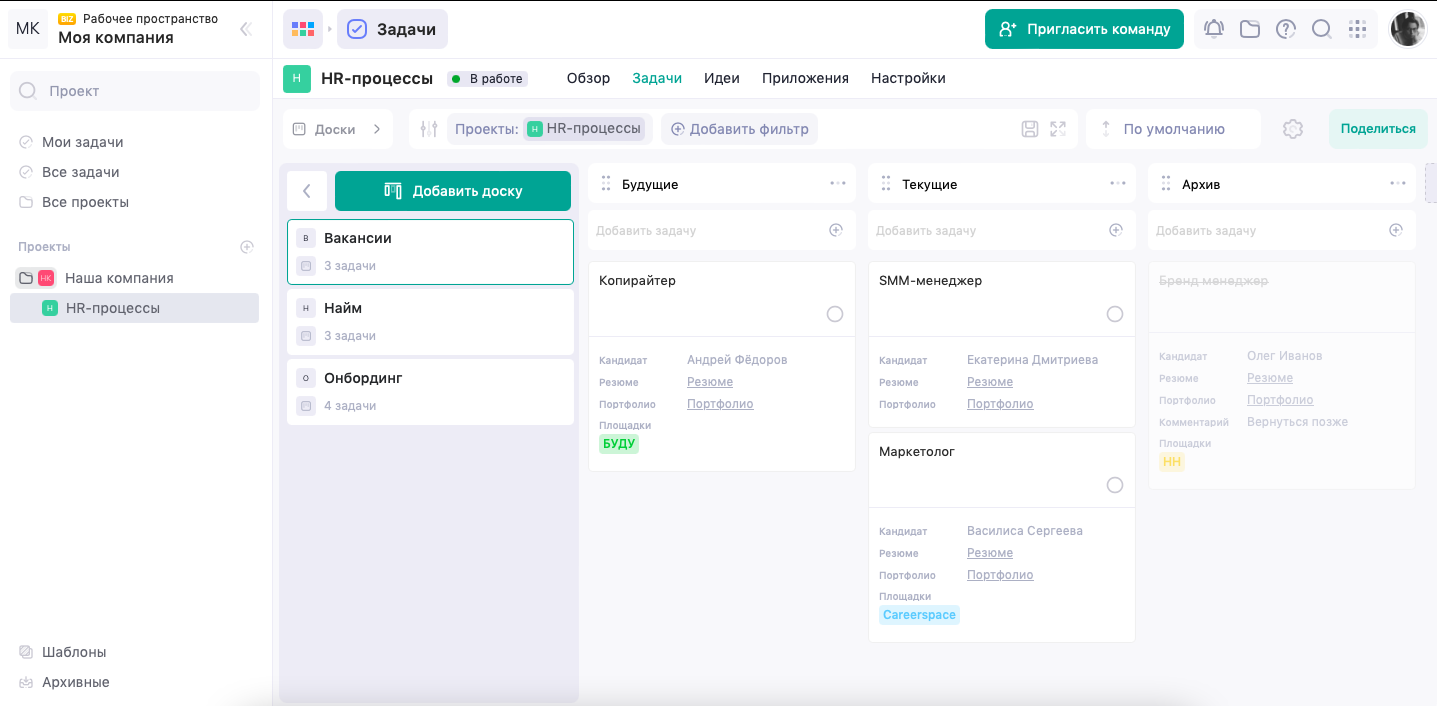 - Связка с задачами: рекрутинг живет там же, где и проекты команды;
