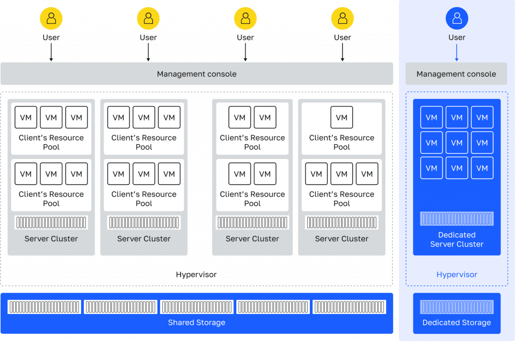 В публичных облаках вычислительные ресурсы разделены между всеми клиентами, а в частном полностью выделены конкретному клиенту — в этом основное отличие и преимущество private cloud.