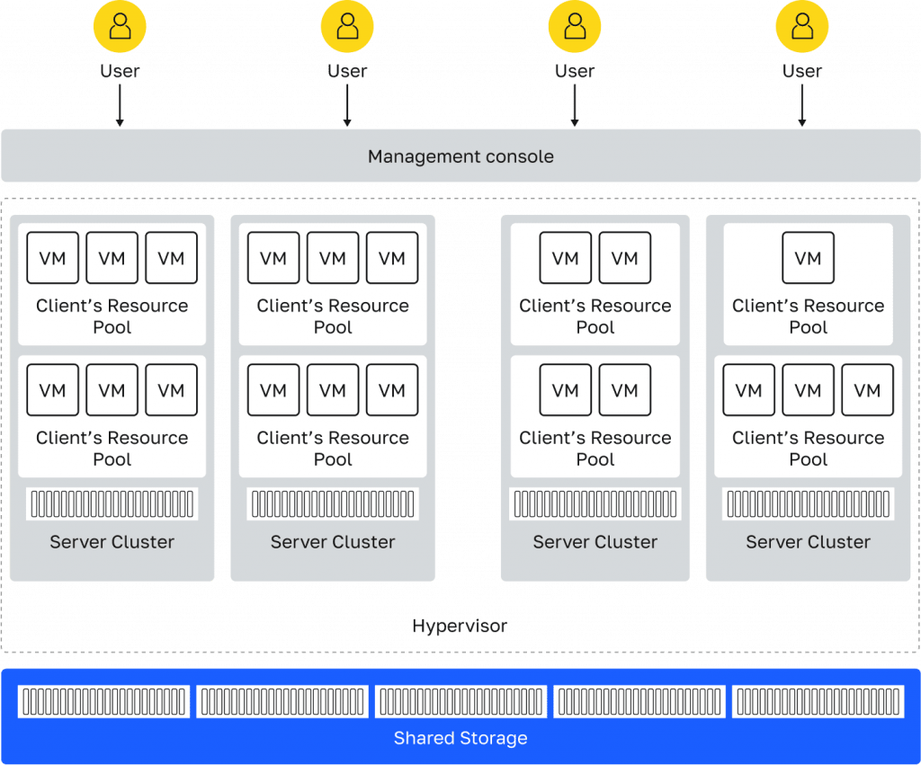 В публичных облаках вычислительные ресурсы разделены между всеми клиентами, а в частном полностью выделены конкретному клиенту — в этом основное отличие и преимущество private cloud.